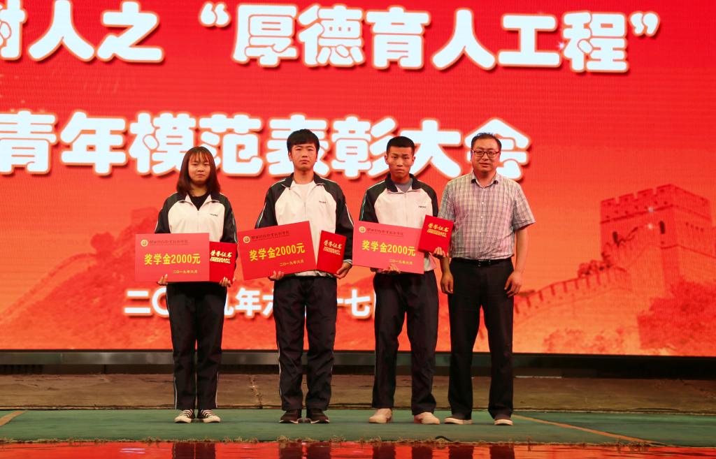 表彰大会由学生处处长雷旭宣读《陕西财经职业技术学院关于表彰“崇德向善青年模范”的决定》,授予刘家琪、刘壮、阴凡静三位同学“崇德向善青年模范”荣誉称号,并依据《陕西财经职业技术学院优秀学生奖学金评定办法》给予三名同学享受2019年“学生年度人物奖学金”的奖励。学院院长程书强为荣获“崇德向善青年模范”荣誉称号的三位同学刘家琪、刘壮、阴凡静颁发荣誉证书及奖金。