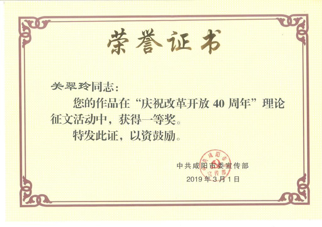 近日,由咸阳市委宣传部联合咸阳日报社举办的“庆祝改革开放40周年理论征文活动”比赛结果已公布,我院思政课教师关翠玲的作品《论马克思主义中国化的内生力》荣获大赛一等奖。