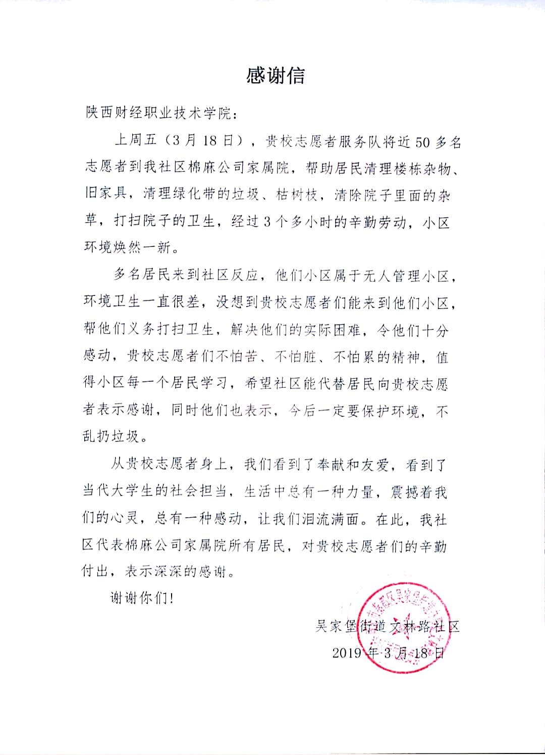 近日,我院收到吴家堡街道文林路社区向我院发来的感谢信,对我院大学生志愿者甘于奉献、不怕吃苦的志愿服务精神高度赞扬。