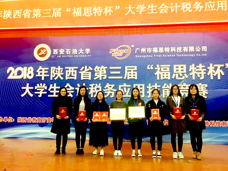陕西省第三届“福思特杯”大学生会计税务应用技能竞赛于2018年10月27日,在西安石油大学鄠邑校区隆重举行,我校由林琳、朱红霞、薛媛指导的会计学院代表队和黄敏、张宽、秦珊珊指导的管理学院代表队均获得特等奖。