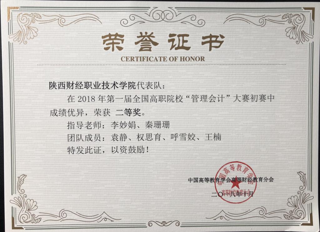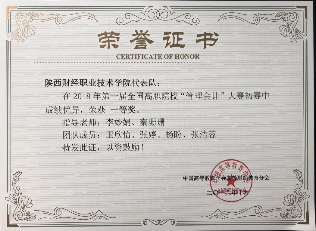 2018年9月29日,由中国高等教育学会高等财经教育分会主办、由厦门网中网软件有限公司、中华会计网校协办的第一届全国高职院校“管理会计”大赛初赛(省赛)在激烈角逐中落下了帷幕。此次大赛陕西省共有十几所高职院校共二十多支队伍参赛,我院两支代表队以陕西省第一名和第三名的成绩脱颖而出,顺利进入全国总决赛。由我院管理学院李妙娟、秦珊珊老师指导的张婷、杨盼、卫欣怡、张洁蓉四名同学获得了陕西省团体一等奖,权思育、呼雪姣、袁静、王楠四名同学获得了陕西省团体二等奖。