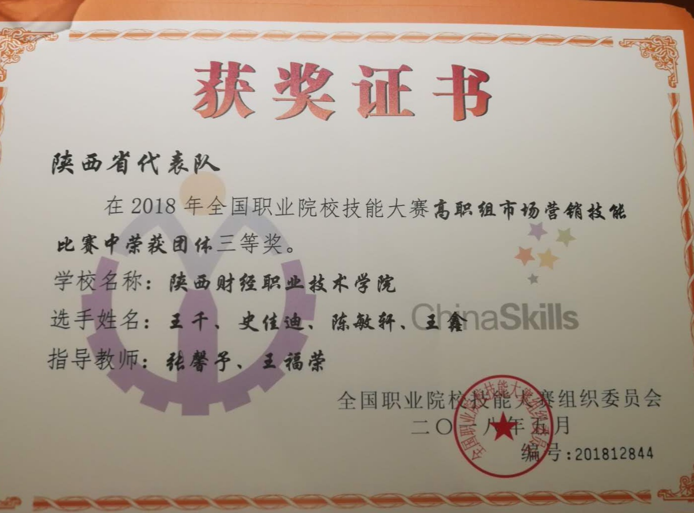 5月19-20日,2018年全国职业院校技能大赛“市场营销技能”赛项比赛在山东商业职业技术学院隆重举行。来自全国的32个省市、84所院校的336名选手参加了比赛,经过激烈的角逐,我院经济与金融管理系张馨予、王福荣老师指导的2016级市场营销二班陈敏轩、16级市场营销一班史加迪以及2016级物流管理班王鑫、王千四位同学代表陕西省代表队斩获团体三等奖。