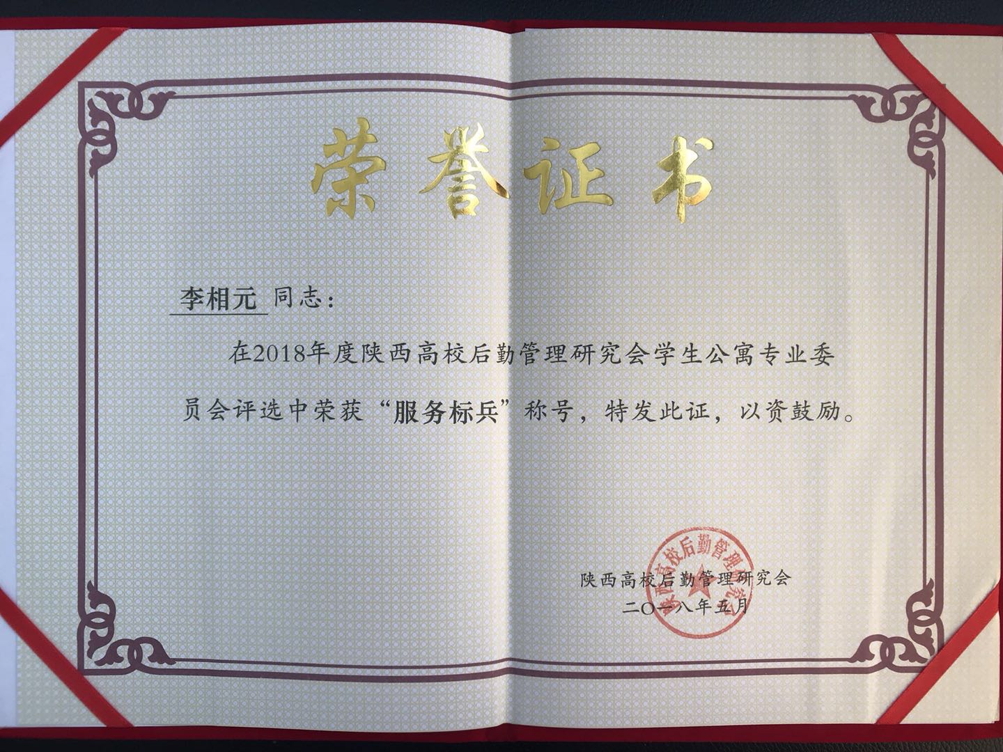 5月11日,2018年陕西省高校后勤管理研究会学生公寓专业委员会年会暨学生公寓管理服务工作表彰会在商洛召开,会上对高校公寓表现优秀的先进个人进行表彰,我院学生公寓管理科贺艳艳同志荣获“优秀员工”称号,李相元同志荣获“服务标兵”称号。