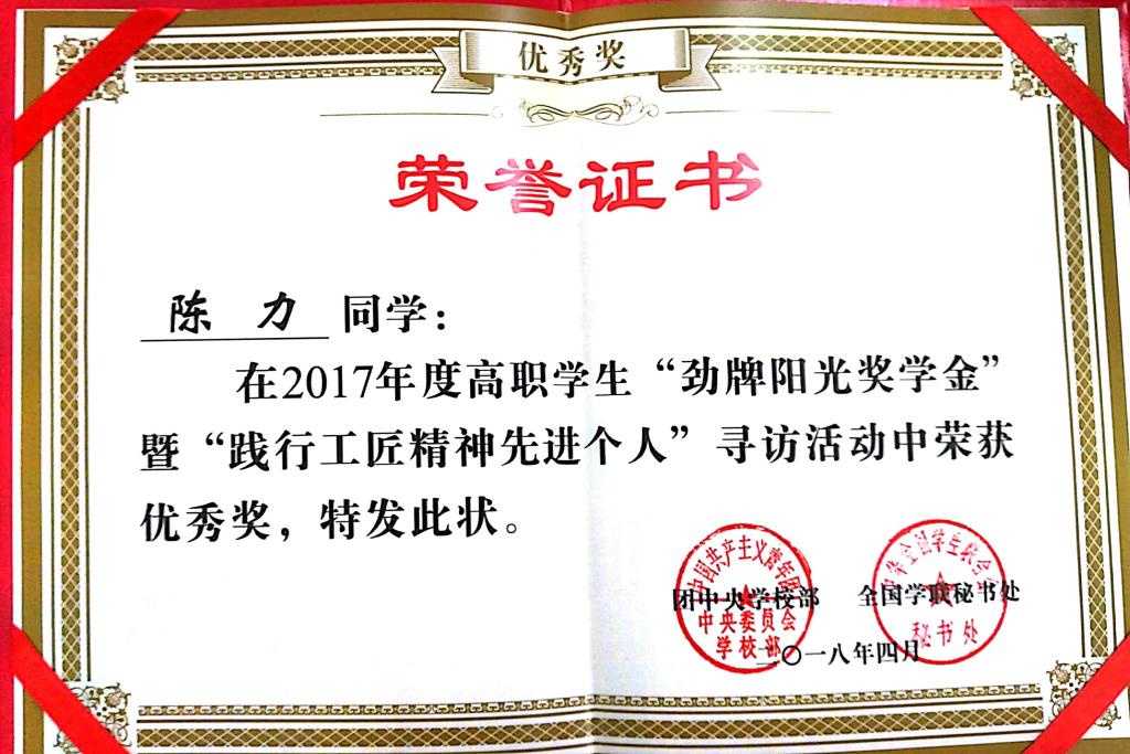 “劲牌阳光奖学金”是全国学联秘书处、劲牌有限公司共同举办的在全国高职院校学生范围内的评选活动。我院经过校级寻访上报团省委,再进行省级遴选推送到全国进行评审和网络公示,重重选拔,我院陈力同学最终获此殊荣,他是我院大学生艺术团团长,此次获奖为全院师生树立了积极向上、践行工匠精神的榜样。