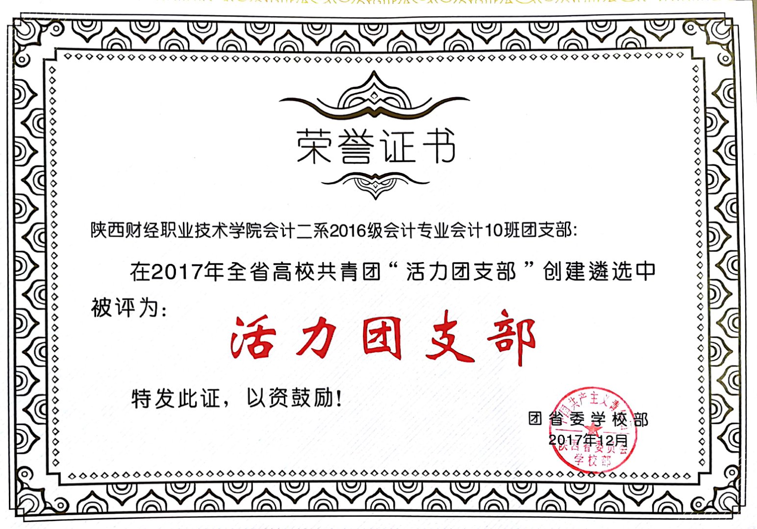 近日,由团中央学校部发布的2017年度“劲牌阳光奖学金”暨“践行工匠精神先进个人”寻访活动公示中,我院2016级经济与金融管理系金融1班陈力同学荣获国家级“劲牌阳光奖学金”优秀奖,共青团陕西省委发布的《关于2017年全省高校共青团“活力团支部”遴选结果的通报》中,我院2016级会计一系会计2班团支部、会计二系会计10班团支部获得省级“活力团支部”荣誉称号。