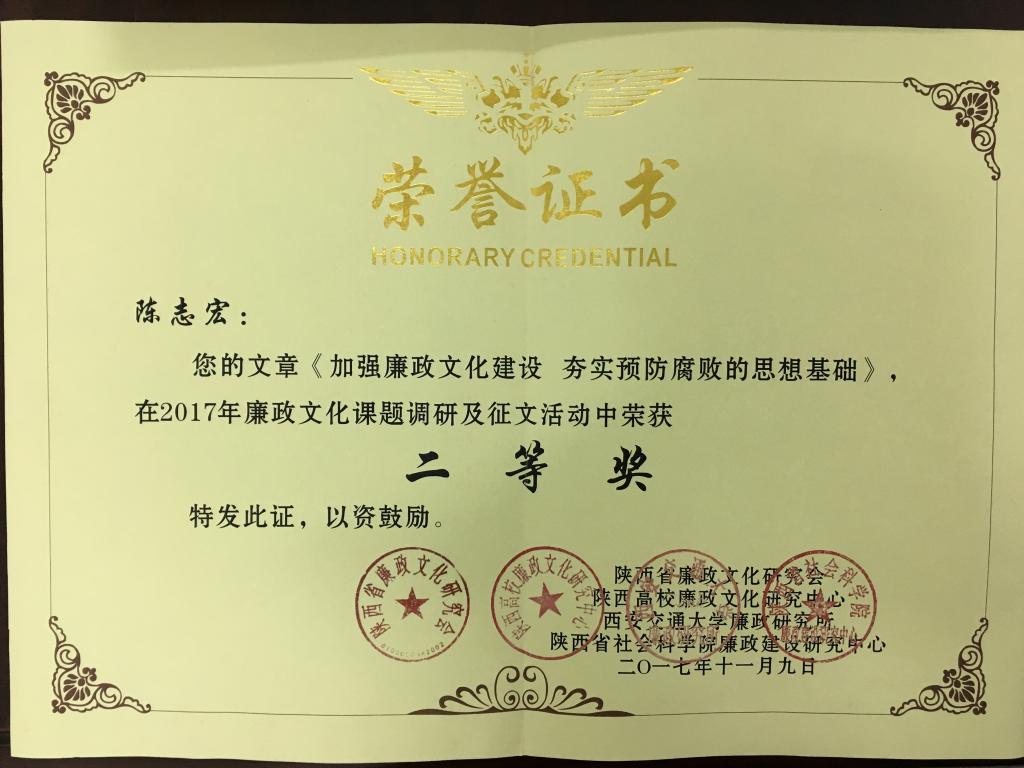 从陕西省廉政文化研究会,陕西高校廉政文化研究中心《关于2017年学习十九大精神暨延安精神与全面从严治党学术研讨会征文的表彰决定》(陕廉研〔2017〕5号)文件获悉,我院思想政治理论教学科研部副主任陈志宏的廉政文章《加强廉政文化建设夯实预防腐败的思想基础》获得本次征文比赛二等奖。