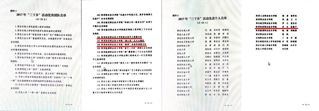 2017年11月22日,中共陕西省委宣传部、中共陕西省委高教工委、陕西省文明办、陕西省教育厅、共青团陕西省委、陕西省学生联合会等六部委联合下发《关于2017年陕西大中专学生志愿暑期文化科技卫生“三下乡”社会实践活动的通报》,我院荣获全省“优秀组织单位”称号,“青衿”传统文化支教服务队荣获全省“标兵团队”称号,普法宣传志愿服务队、“蒲公英”艺术支教队、“微邦”电商网校服务队荣获全省“优秀团队”称号,张馨予、乔乐荣获全省“先进个人”称号。