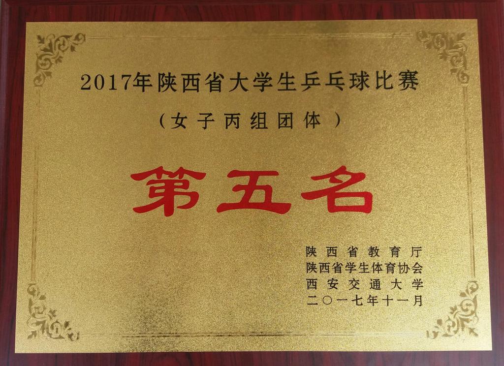 由省教育厅主办、省学生体育协会、西安交通大学承办的“2017年陕西省大学生乒乓球赛暨‘校长杯’比赛”学生组比赛于11月7—10日在西安交通大学体育中心举行,我院代表队选派出的16名选手本着拼搏进取、坚持到底、永不放弃的体育精神,团结协作,经过四天的激烈角逐,获得了专科类院校男、女团体第五名的成绩,同时税颖获得女子单打第三名,冯新芳获得女子单打第五名,沙金英/艾希、武宵晴/潘丹丹并列获得女子双打第五名,朱可欣获得男子单打第五名,魏声老师获得优秀教练员称号。