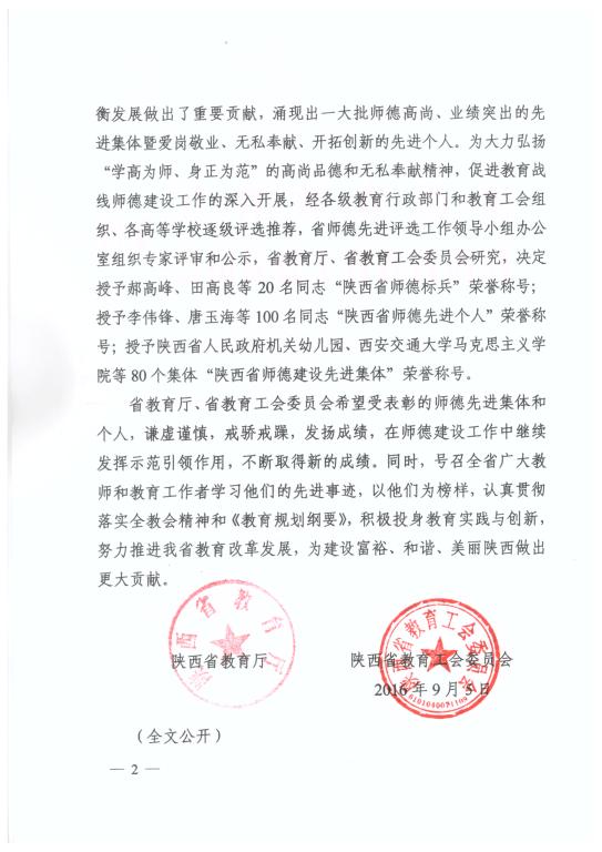 近日,陕西省教育厅、陕西省教育工会联合发文陕教(2016)167号,对全省20名师德标兵、100名师德先进个人、80个师德建设先进集体进行了表彰,我院董媛老师被评为“2016年陕西省师德先进个人”荣誉称号。