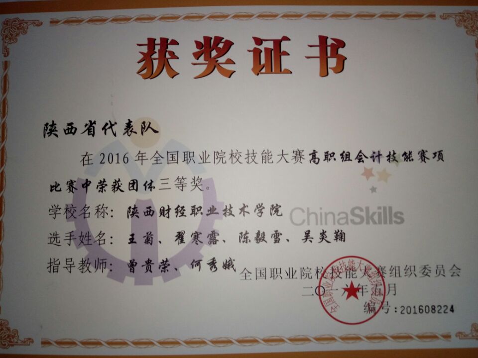 6月4日,2016年全国职业院校技能竞赛高职会计技能竞赛在山西财政税务专科学校举行。代表陕西省参赛的我院代表队荣获团体三等奖。团队总体成绩和位次,相对去年均有较大提高。