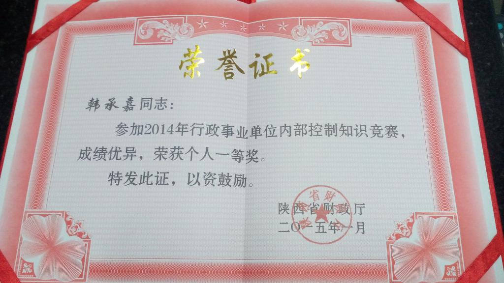近日,由国家财政部主办、省财政厅协办的“2014年行政事业单位内部控制知识竞赛”获奖结果揭晓。我院财务处韩承嘉荣获大赛个人一等奖,受到了省财政厅的表彰。