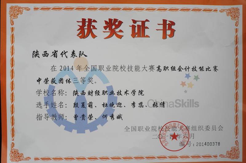 5月31日,2014年全国职业院校技能竞赛高职会计技能竞赛在山西太原山西财政税务专科学校举行。代表陕西省参赛的我院代表队荣获团体三等奖。