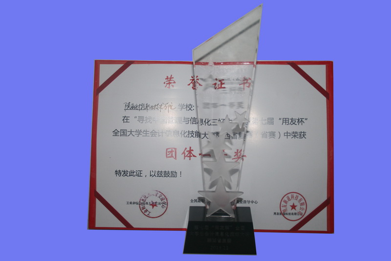 11月3日,2013年“寻找中国管理与信息化三好生”暨第七届“用友杯”全国大学生会计信息化技能大赛陕西赛区复赛在延安举行,来自全省十所院校的19支代表队在延安职业技术学院展开激烈的角逐。我院派出了由10名学生组成的两支代表队获得了团体第一名的好成绩。其中袁娅丽、张晓艳、郝萌萌3位同学包揽了个人一等奖,获得全国总决赛入场券;其余7名同学在个人赛中有3名获得了二等奖,4名获得了三等奖。信息工程系李迎老师、阎栋老师获得了优秀指导老师荣誉称号。