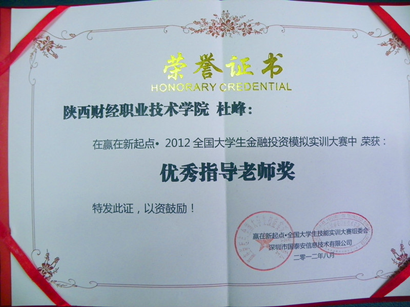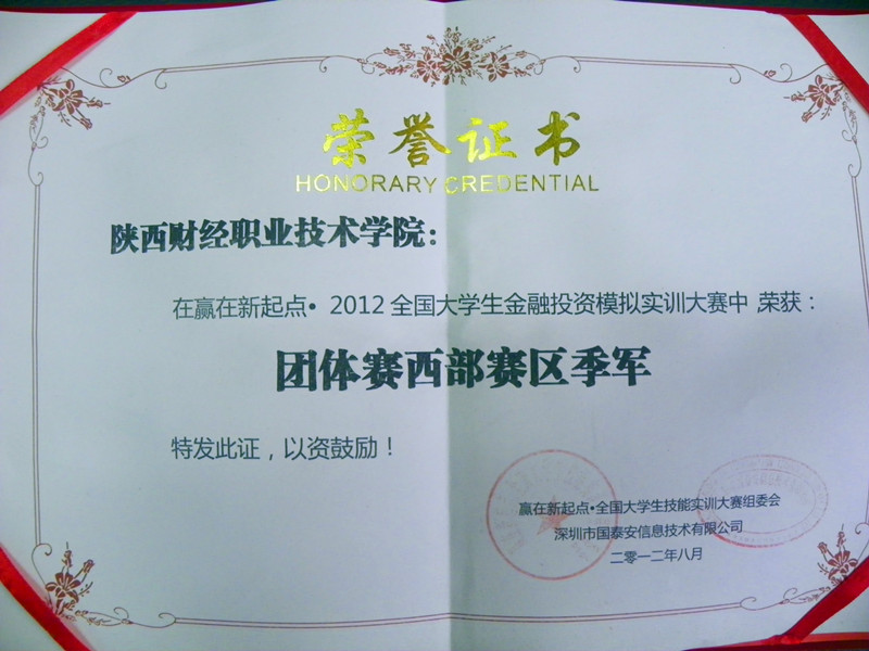 近日,我院在全国大学生金融投资模拟实训大赛中获得团体赛西部赛区季军,财税系教师杜峰获得优秀指导老师奖,2010级金融班程秀鸣等8名同学获得个人比赛西部赛区优秀奖。