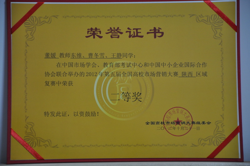 10月21日,“第五届全国高校市场营销大赛陕西赛区复赛”在西安举行,来自全省的15所院校代表队参加了此次大赛,我院代表队喜获省赛二等奖,工商管理系董媛老师荣获“优秀指导老师”称号。