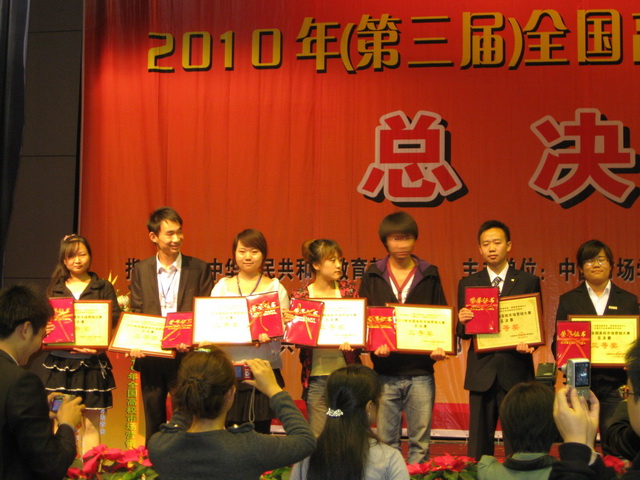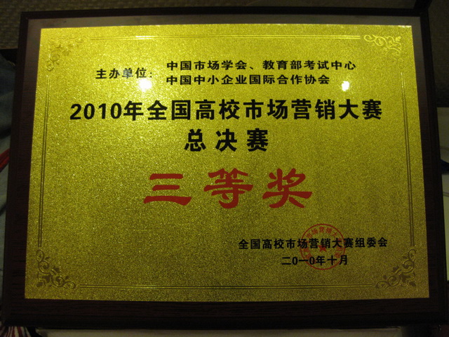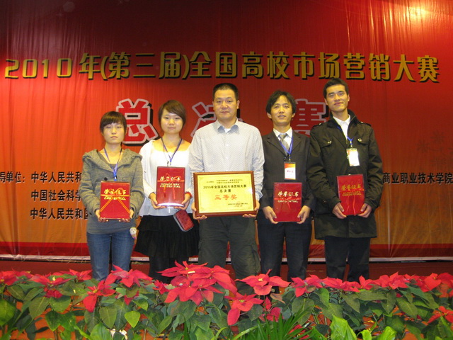 2010年10月23日至24日,由工商管理系副主任邓迪夫带队,雷锋刚老师指导的我院“财经人”策划团队,在浙江商业职业技术学院举办的2010(第三届)全国高校市场营销大赛总决赛中喜获三等奖,为我院示范性院校建设贡献力量,为我院50华诞校庆增光添彩。