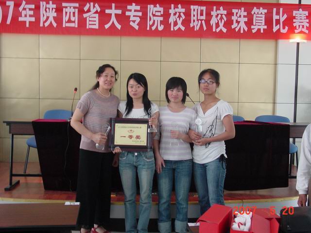 5月20日上午,陕财职院珠算代表队在邓迪夫和任晓华老师的带领下,参加了陕西省珠算协会组织的“2007年陕西省大专院校职校珠算”比赛,取得了骄人的成绩,教练员及所有选手全部获奖。