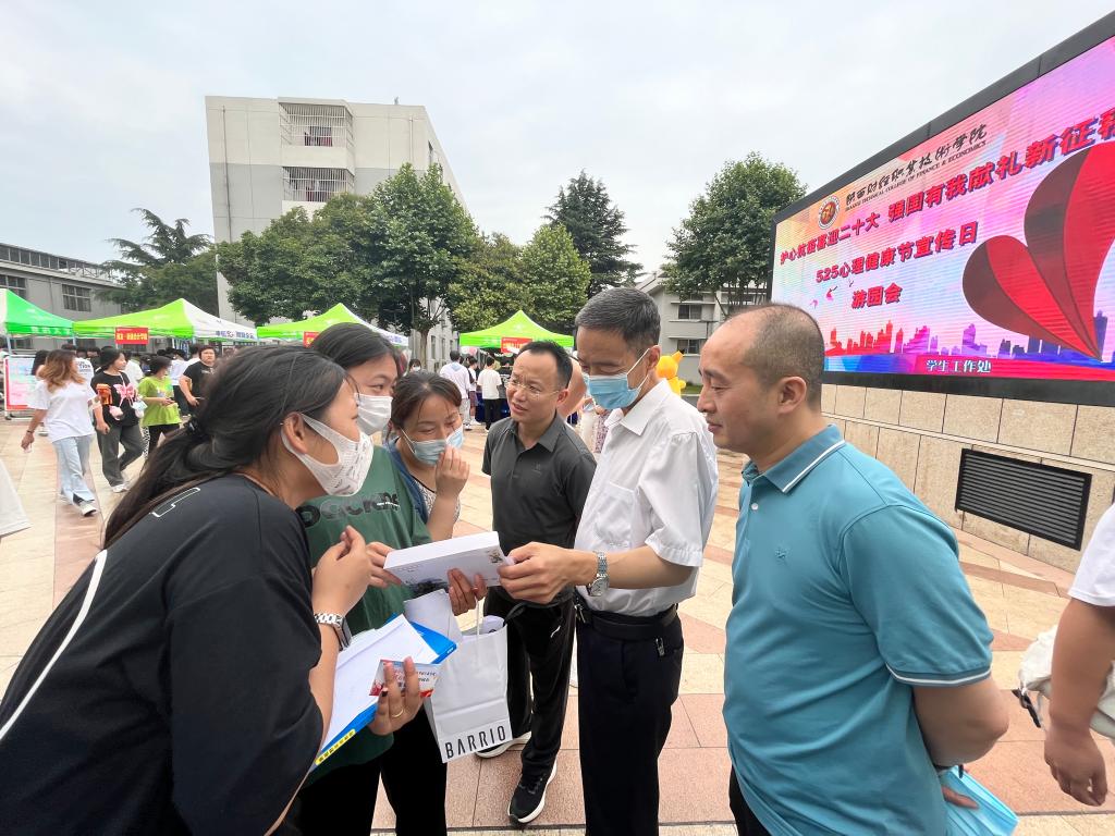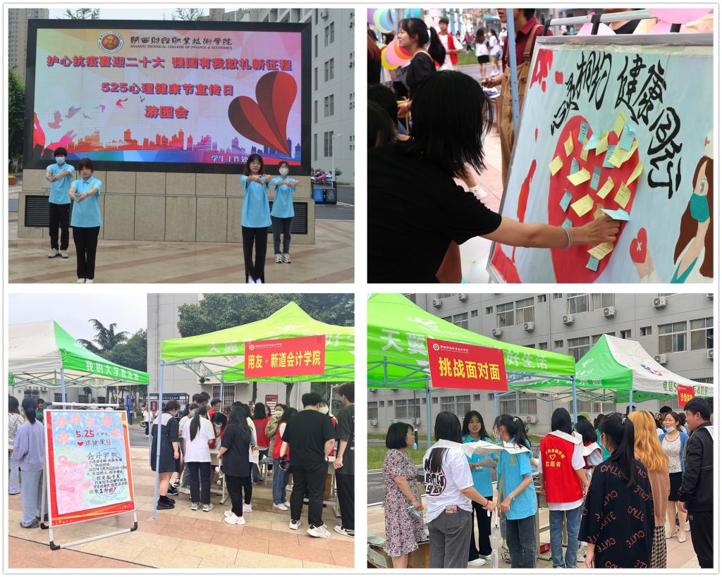 为了全面提升心理育人工作质量,提高师生心理健康水平,培养学生自尊自信、理性平和的良好心态,带动学生以积极向上、奋发有为的姿态迎接党的二十大,5月25日下午,我校在财经文化广场举办了“护心抗疫喜迎二十大、强国有我献礼新征程”525心理健康节之心理游园会活动。学校副院长张秦龙出席现场启动开幕式,学生处负责人、专兼职心理健康教师、辅导员、心理委员、馨心社成员及各级各班学生累计近千人参加活动。