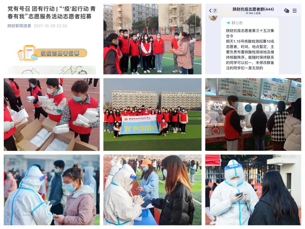 凸显团的组织力,汇聚青春防疫力量。疫情发生以来,校团委建立“校志愿服务工作部+二级学院志愿服务队+各类服务志愿者”三级联动机制,组织各二级学院团总支、校学生会、青年志愿者协会主要团学骨干成立“校园防疫突击队”,勇挑重担、冲锋在前,化身“天使白”、“志愿红”投身抗疫志愿服务;成立“临时团支部”发挥团支部的战斗堡垒作用,及时做好疫情期间各项工作,确保信息和渠道畅通;建立志愿者招募QQ群,累计发布志愿者集合令30次,每次发布工作任务,青年志愿者纷纷表示“我可以”“我报名”“又是拼手速的一天”,充分彰显陕财学子的家国情怀和责任担当。截至1月17日,已有校院两级875人次参与协助全员核酸、校园巡逻、文明劝导、物资搬运、疫苗接种、学生返乡等志愿服务工作,累计服务时长6000余小时,完成核酸检测9轮7.5万人次,进行校园巡逻、文明劝导80余次,协助疫苗接种近4000人次,护航学生返乡近8500人次,搬运物资近5吨。
