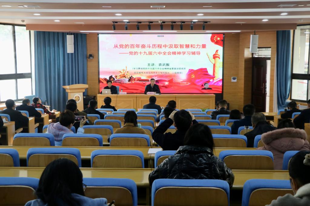 2021年12月9日下午,我校在继续教育培训厅召开党的十九届六中全会精神宣讲报告会,特邀省委宣讲团成员、西安邮电大学马克思主义学院院长袁武振教授宣讲,党委副书记朱华斌主持。宣讲报告会采取线下线上相结合的方式,校领导,处级中层干部,各党总支、党支部书记近80人现场参加,500余名师生通过分会场和腾讯会议线上学习。