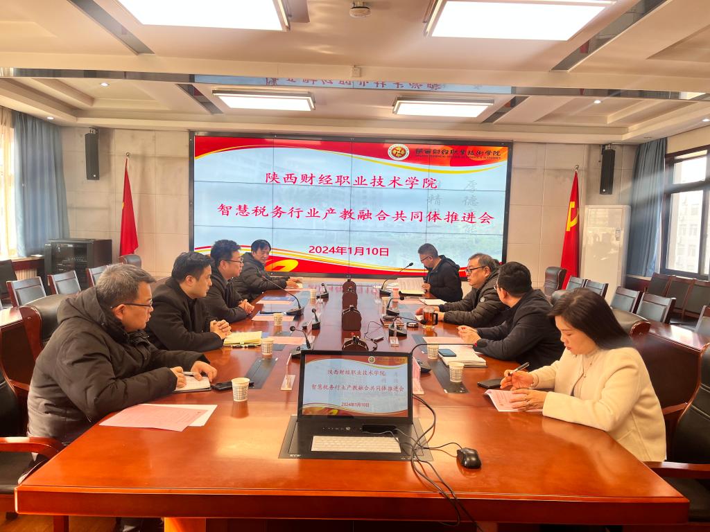 1月10日上午,我校在办公楼四楼会议室召开全国智慧税务行业产教融合共同体筹建工作推进会。浙江衡信教育科技有限公司总经理李高齐及陕西省区经理蔡廷凯、中教畅享科技股份有限公司区域经理邢竣翕、中联集团教育科技有限公司陕西区域负责人赵子军、厦门网中网软件有限公司省区总经理鲁盛峰等企业代表参会,校长程书强出席会议并作工作部署,会计学院院长常茹、数字商务学院院长董媛、教务处副处长李福顺、双高办副主任雷锋刚以及教务处、双高办相关人员参加会议。会议由教务处处长刘军主持。