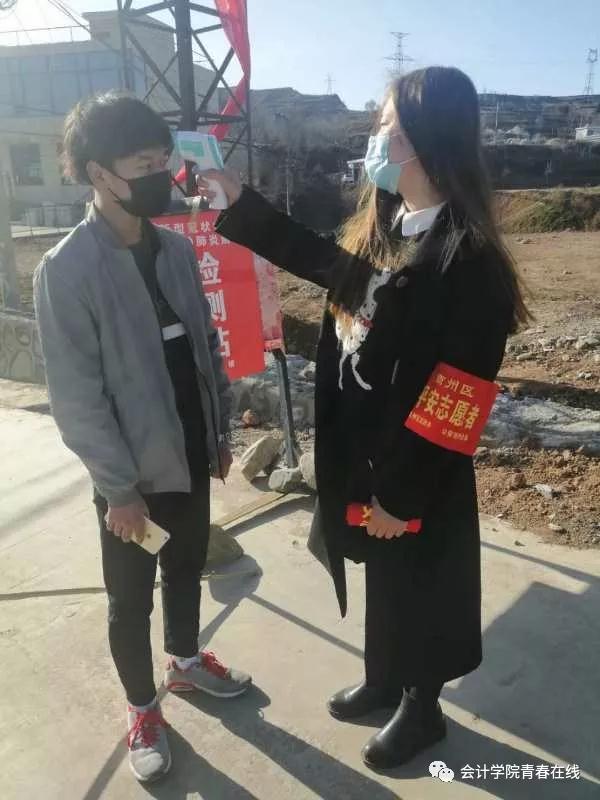 李欣,我校用友•新道会计学院2017级会计9班副班长,共产党员,优秀学生干部。春节,本应该是家人团聚的幸福日子。庚子鼠年,新型肺炎的爆发打破了原有的欢乐气氛。听闻村里(陕西省咸阳市淳化县胡家庙镇沟里村)设置了疫情防控点,作为一名党员,李欣认为此时此刻应该发挥党员的先锋模范带头作用,勇当先锋,抗击疫情,为村民的安全,为村里的疫情防控工作奉献自己的力量,主动申请加入志愿者服务队。每日清晨,她在村口的疫情防控点提前竖起警示牌,为每天要站岗的村干部做好准备工作,摆好登记册,测温仪等。在工作中认真地跟随村干部排查来往行人,热心解答行人们关于新型冠状病毒的困惑,做好体温的检测和记录,确保每一位村民的健康安全。
