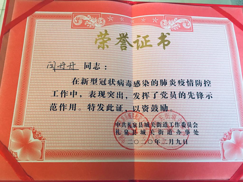 2月10日下午城关镇书记张越锋在村口为她颁发了荣誉证书。表扬了她在这次疫情中做出的贡献,希望她继续努力,对抗疫情。
