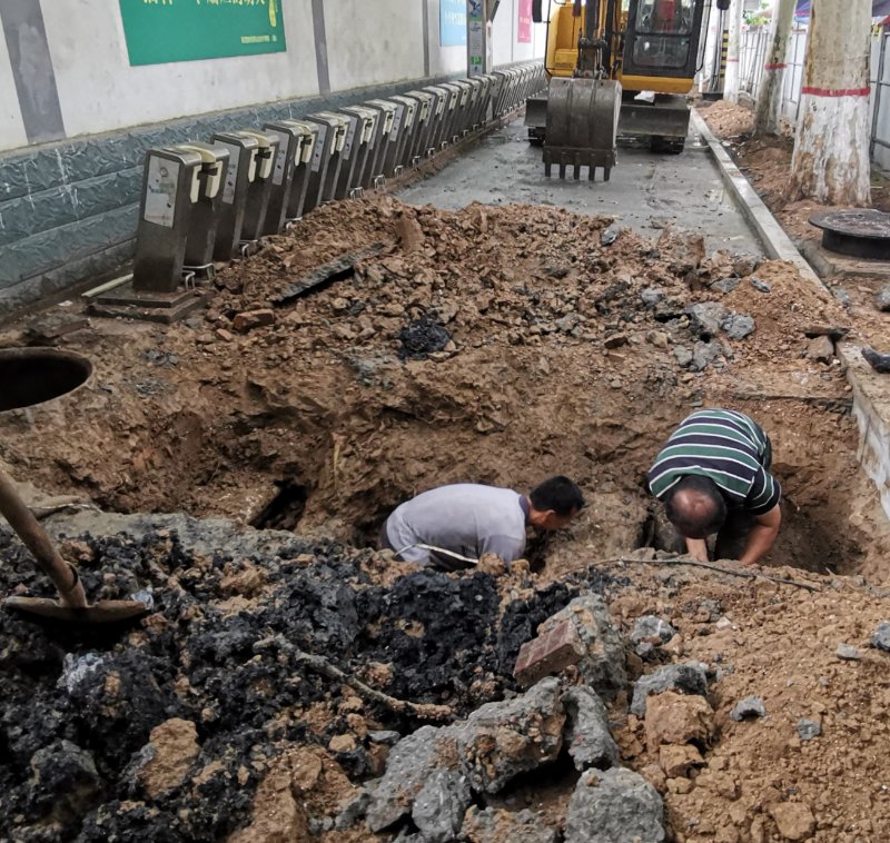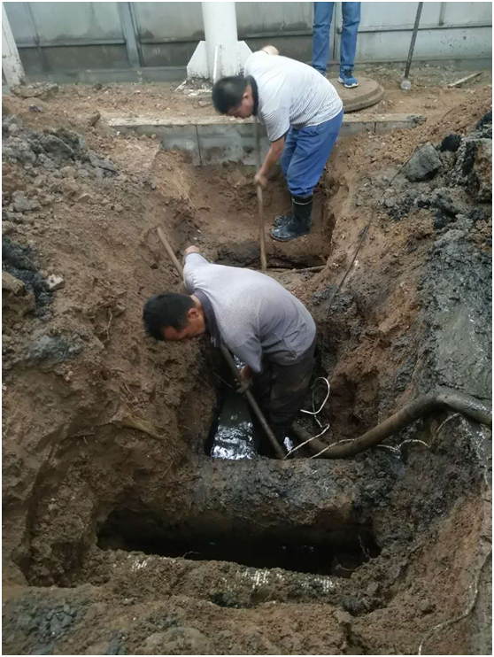 午饭后,天虽然下着雨,但水暖工陆季忠、王平安、张争利、安二定等同志,冒着雨进行开挖作业,污泥溅到了身上,臭味扑鼻而来,但大家无人退缩,干劲实足,约下午5点多钟,已开挖到底,疏通了下水,排除了学院东区下水溢满的险情。因我院南墙外人行道下方排水管在市政东西走向管网的下方,维修施工难度,计划到二十日晚可完成此项抢修工作。