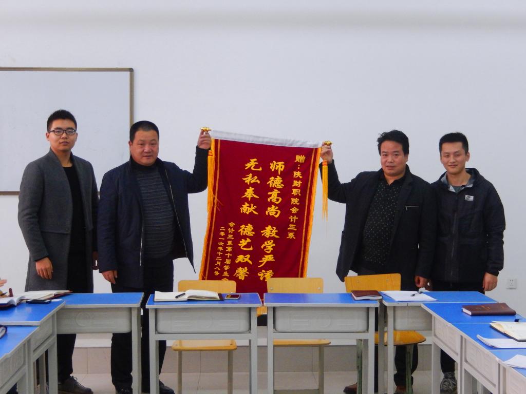 12月14日下午党课结束后,会计三系主任邓迪夫与专职副书记张晓战收到来自第十届学生分会赠送的锦旗。锦旗上书写着“师德高尚教学严谨 无私奉献 德艺双馨”十六个字。简单的十六个字,却包含了千言万语。樊成浩与魏嘉伟代表全体学生会成员发言。他们感谢在学生会工作这一年里,各位老师谆谆教诲,给予自己展示自我的平台,使自己得到了锻炼。即将离校步入社会,心有万般不舍,赠送锦旗聊表对各位老师的感激之情。