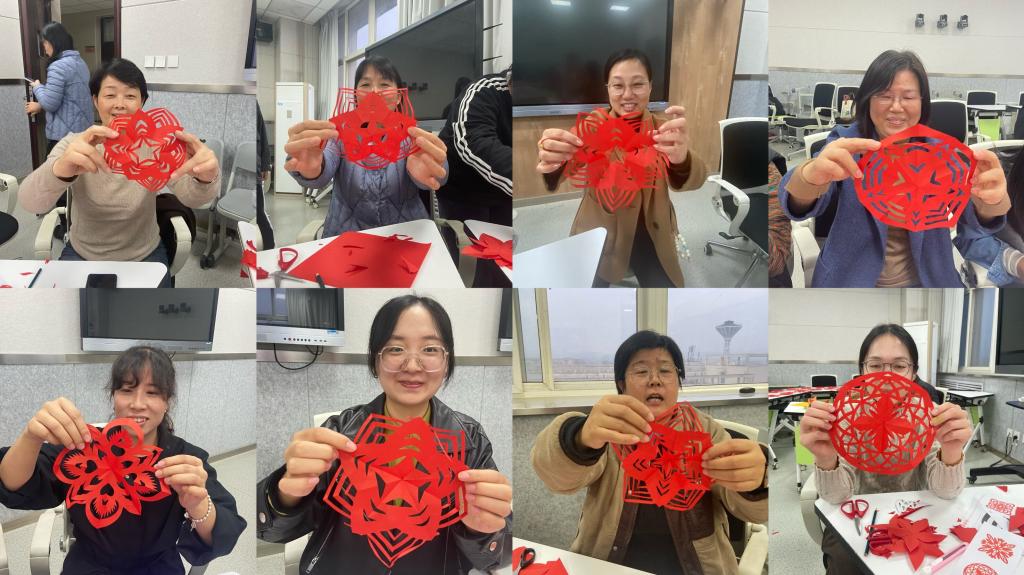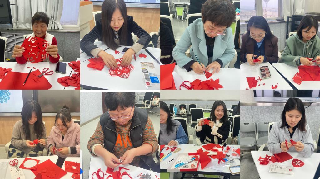 女职工委员会邀请了学校纪委综合室综合科副科长、剪纸社团指导教师王炅进行现场指导。王老师为老师们重点讲解了剪纸的基本方法和技巧,并示范了剪纸步骤。在掌握了“折、画、剪”的小窍门之后,老师们积极动手操作,一双手、一张纸、一把剪刀,让普普通通的纸张在指尖焕发别样的风采,不一会儿,美轮美奂的窗花便跃然纸上。