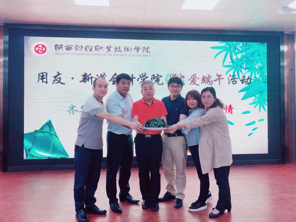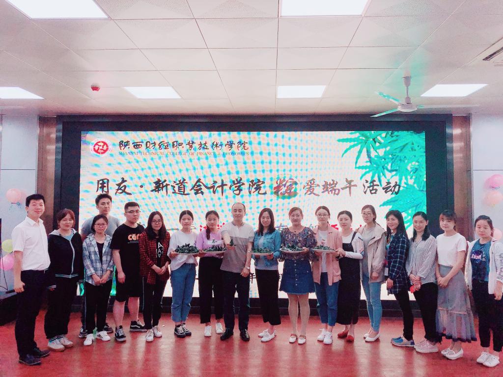 6月5日下午4点30分,用友·新道会计学院在教工食堂成功举办了“齐聚一堂过端午 粽有万般师生情”为主题的“粽爱端午”师生趣味活动。会计学院院长李启明、党总支书记乔晶策、副院长缑宇英、各教研室老师、学生科辅导员及六十余名学生代表约110余人参加了此次活动。新道科技股份有限公司教育服务BG总经理贾大明、西北大区总经理张桐、陕西区营销总监张丽三位企业大咖也亲临活动现场,与我院师生共度端阳。