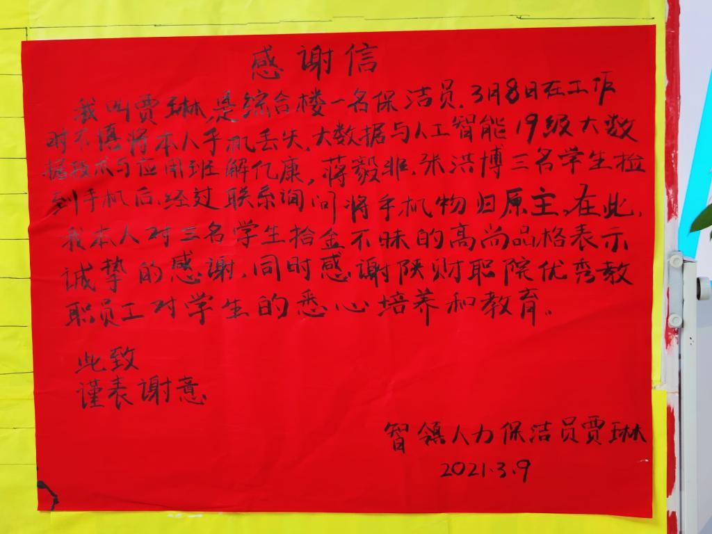 2021年3月8日,大数据与人工智能学院19级大数据技术与应用一班解亿康、蒋毅非、张洪博三名同学于综合楼捡到手机一部,经过多方联系找到失主_保洁员贾阿姨,手机交到贾阿姨手中后不留姓名便悄然离开,这种拾金不昧不留名的高尚品质深深感动了贾阿姨。后来贾阿姨通过大数据与人工智能学院学生工作科寻找到这三名同学,希望用感谢信的方式,感谢三位同学高尚的道德修养和精神风貌,同时,感谢大数据与人工智能学院对他们的培养和教育。