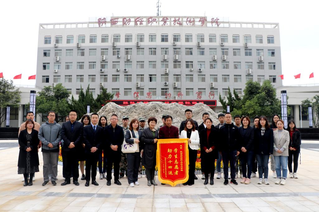 10月12日,陕西森永润客食品有限公司经理庞宇红女士一行4人来到我院商学院志愿者送锦旗,以表达对商学院十四运志愿者的谢意和肯定。商学院院长董媛代表学院接受锦旗。人文艺术学院院长贺兴文、商学院副院长李福顺、学生科科长杨阳、团总支书记刘明、教学科科长李栋、办公室副主任窦小雨及全体辅导员、学生志愿者一行与企业合影留念。