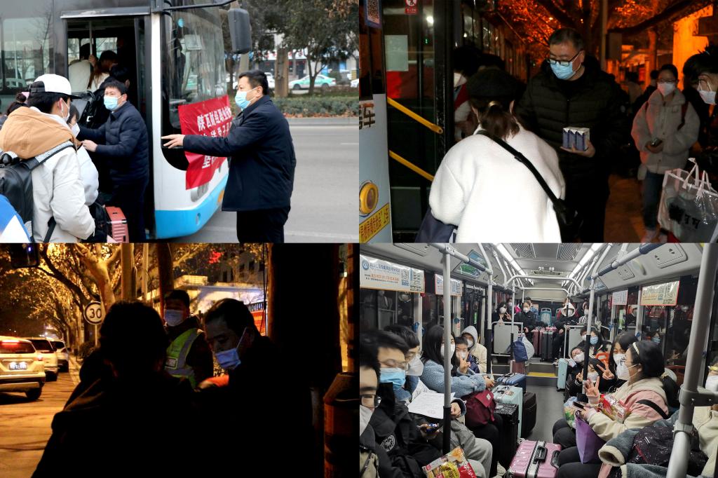 2022年1月15日,是陕西财经职业技术学院学生放寒假第一天,早上6:00左右,同学们在学校大门口一边高兴地交谈着,一边有序登记、扫码、领表,在辅导员和志愿者的指引下,登上停放在校门口的大巴车,分别前往咸阳火车站、咸阳西站、咸阳北站乘车回家。