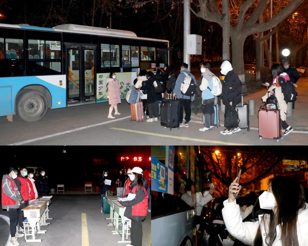 学校为每个学生配发了5只医用外科口罩、2只N95口罩、消毒湿巾,在回家和返校途中加强防护。还为早晨出发的学生准备了牛奶、面包。凌晨5:50,室外气温零下3℃,院长程书强在寒风中忙碌着,为学生送行,反复叮咛学生带好口罩,做好防护,回家后遵守当地疫情防控要求;副院长雷旭在现场指挥学生有序上车,交代学生路上照顾好自己。随后,党委书记张志华来也到现场嘱咐学生注意路上安全。虽是隆冬时节,同学们心里却很温暖,真心感谢学校为大家提供了超级“VIP”服务。虽是隆冬时节,同学们心里却很温暖,真心感谢学校为大家提供了超级“VIP”服务。