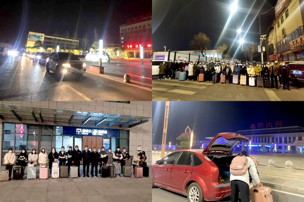 1月15日,学校组织了4辆公交车、1辆大巴车,在学校与咸阳火车站、咸阳西站、咸阳北站之间不间断摆渡,免费运送学生。目前学校在岗教职工200余人,他们和家属自发组建了近百辆私家车的爱心车队送学生到车站。1月15日凌晨4点40分,有20多位老师开着私家车,护送50多位同学到车站。学校和老师们用行动表达了对学生深沉的情感,虽是冬日,爱暖在心间。