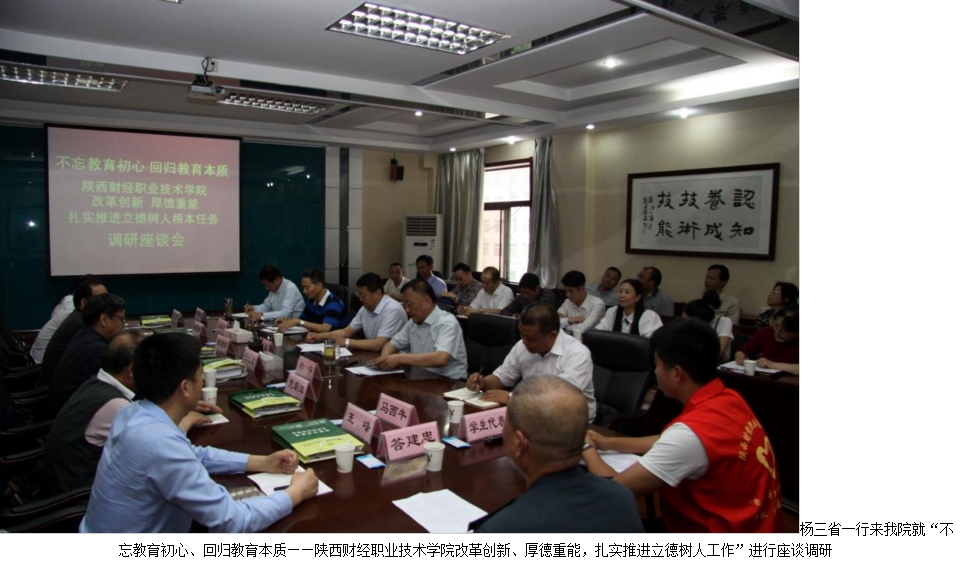 5月5日下午,省政府研究室主任、党组书记、省委候补委员杨三省教授一行6人对我院厚德育人工作进行调研。陪同调研的有省政府研究室秘书处处长田民孝,省政府研究室秘书处主任科员张文莉、王峰,陕西日报社原副主编杨建民,陕西日报社原宣教部主任党朝晖。三省一行来我院就“不忘教育初心、回归教育本质——陕西财经职业技术学院改革创新、厚德重能,扎实推进立德树人工作”进行座谈调研。