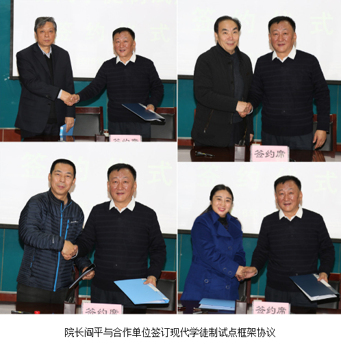 院长阎平致辞。他介绍了学院的教书育人理念、人才培养模式、办学特色亮点、办学治校成果等基本情况。他引用省巡视诊断专家组“学院特色鲜明”“聚焦优势专业”“招生就业两旺”三项评价,向签约单位呈现了学院在高职教育领域的发展优势。在谈到治校育人时,他说,教育百年大计要施肥到根,根是素养,根深才能叶茂。回归教育育人本质,就是要“长善救失”,具体到高职院校,就是要以“认知、养成、技术、技能”为思路,培养学生“做人做事”,使学生专业知识“够用”,用人单位反馈“好用”。以“做人做事先做人,德能并重德为先”的理念,将现代学徒制作为人才培养途径,实现学院“出人”培养学生“出彩”。他指出,此次“院所合作”现代学徒制试点工作是高职院校财经类学徒制的探索,也是我院校企合作的一个新的里程碑。