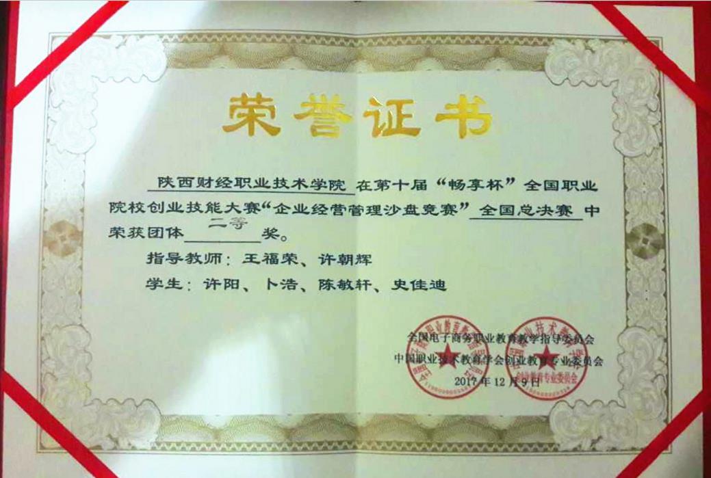 2017年12月8号到10号,“全国职业院校创业技能大赛企业经营管理沙盘模拟赛项”全国总决赛在佛山职业技术学院开赛,来自全国各地有119个学校138支队伍1000多人参赛,本届赛事由教育部全国电子商务职业教育教学指导委员会、中国职业技术教育学会创业教育专业委员会主办,佛山职业技术学院承办。我院经济与金融管理系教师许朝辉、王福荣指导的学生卜浩、许阳、史佳迪、陈敏轩组成的代表队,在竞争激烈的赛场上,取得国赛二等奖。