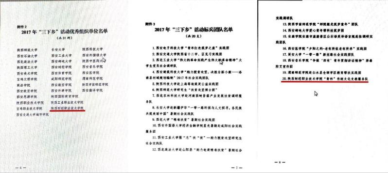 2017年11月22日,中共陕西省委宣传部、中共陕西省委高教工委、陕西省文明办、陕西省教育厅、共青团陕西省委、陕西省学生联合会等六部委联合下发《关于2017年陕西大中专学生志愿暑期文化科技卫生“三下乡”社会实践活动的通报》,我院荣获全省“优秀组织单位”称号,“青衿”传统文化支教服务队荣获全省“标兵团队”称号,普法宣传志愿服务队、“蒲公英”艺术支教队、“微邦”电商网校服务队荣获全省“优秀团队”称号,张馨予、乔乐荣获全省“先进个人”称号。