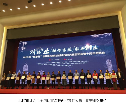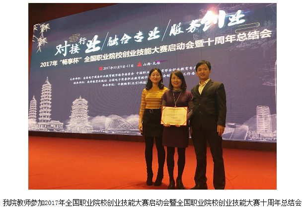 2017年10月10日,由全国电子商务职业教育教学指导委员会、中国职业教育学会创业教育专业委员会组织的2017年全国职业院校创业技能大赛启动会暨全国职业院校创业技能大赛十周年总结会在山西太原召开。我院被评为2008-2017年“全国职业院校创业技能大赛”优秀组织单位。我院经金系副主任景海萍带领物流电商教研室主任张馨予、营销教研室主任雷锋刚参加了此次会议。