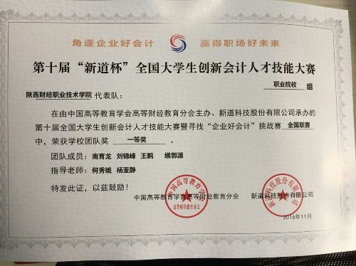 近日,从“新道杯”全国大学创新会计人才技能大赛暨寻找“企业好会计”挑战赛全国联赛组委会传来喜讯,在全国763支参赛队伍和3056名参赛学生中,代表我院参赛的两支队伍分列全国职业院校组团队第一名和第二名,荣获团队一等奖,2名学生获得个人一等奖,4名学生获得个人二等奖,2名同学获得个人三等奖,2名老师被评为“优秀指导老师”。