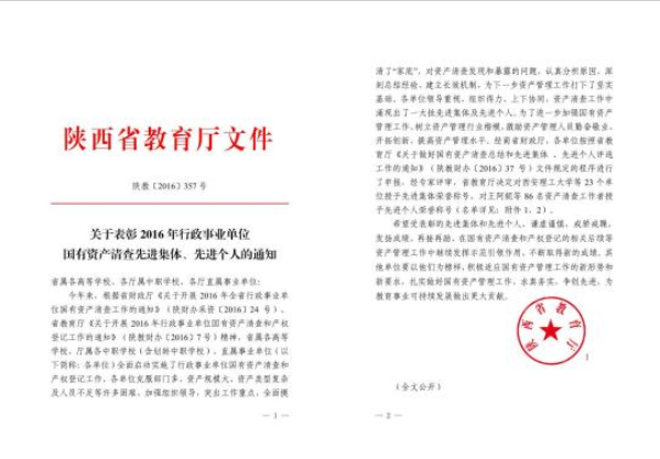 近日,陕西省教育厅发布了《关于表彰2016年行政事业单位国有资产清查先进集体、先进个人的通知》(陕教〔2016〕357号),我院获得了“2016年行政事业单位国有资产清查先进集体”荣誉称号,国有资产管理处边红军同志获得了“2016年行政事业单位国有资产清查先进个人”荣誉称号。