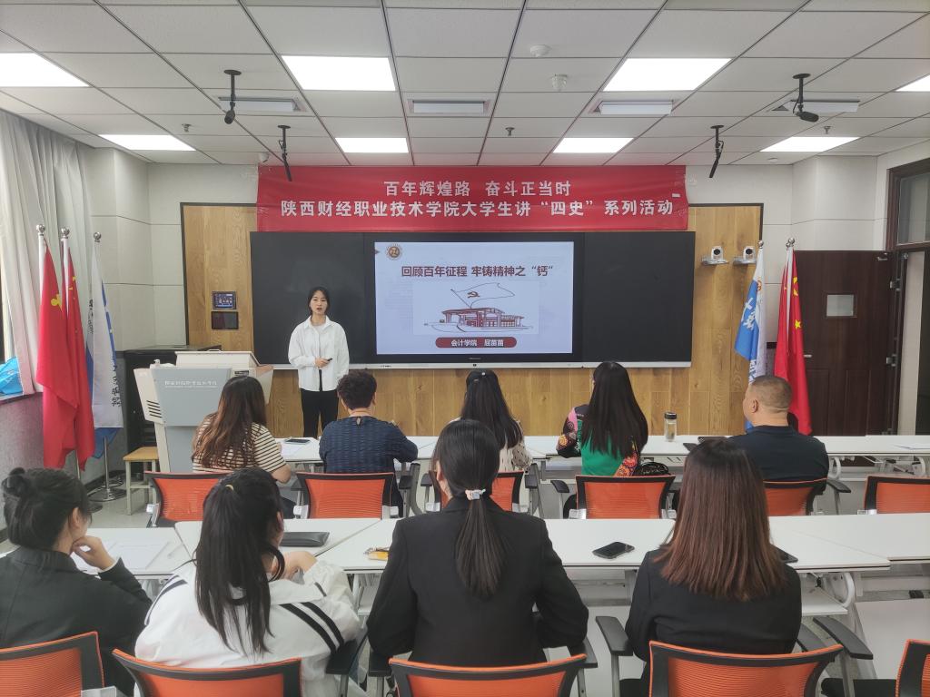 “百年辉煌路,奋斗正当时”,为引导大学生深入学习习近平新时代中国特色社会主义思想,进一步增强学习实效,在学院内深入开党史学习教育,5月14日上午,由马克思主义学院主办的“百年辉煌路,奋斗正当时”——陕西财经职业技术学院大学生讲“四史”展示活动于综合楼516智慧教室顺利举办。活动由马克思主义学院副院长殷蓬勃主持,马克思主义学院全体思政课教师和部分学生代表参加了活动。