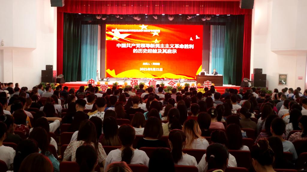 2021年5月21日下午,我院邀请省委教育工委、省教育厅党史学习教育宣讲团成员、西安建筑科技大学周恩毅教授来校在大礼堂为师生作题为“中国共产党领导新民主主义革命胜利的历史经验及其启示”的专题宣讲报告。学院党委书记张志华、党委副书记兼纪委书记刘文青、党委副书记朱华斌以及党员领导干部、支部书记、辅导员、思政课教师、师生党员,发展对象和入党积极分子等1400余人参加报告会。朱华斌主持报告。