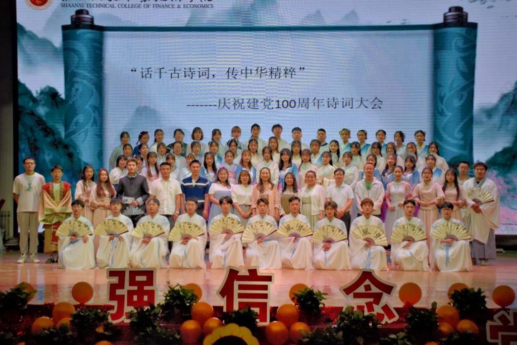 2021年5月20日由陕西财经职业技术学院团委主办,大数据与人工智能学院团总支承办的庆祝建党100周年暨第七届“我的中国梦”大学生校园文化艺术节之“话千古诗词,传中华精粹”诗词大赛在学院大礼堂成功举办。参加本次活动的有团委书记窦曼娟、各二级学院团总支书记、辅导员代表及1300余名学生。