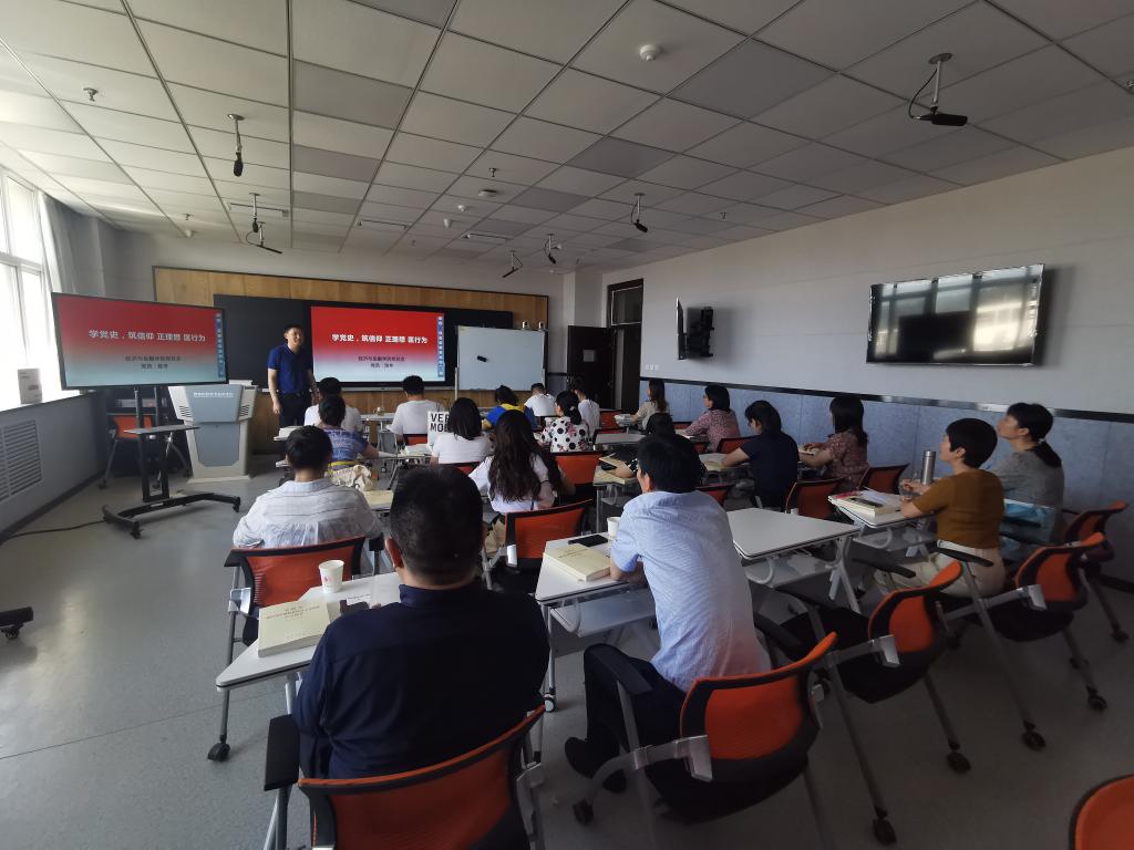 为扎实推进党史学习教育,2021年6月4日下午,经济与金融学院党总支副书记陈冬在综合楼716智慧教室,为经金学院全体教师党员做“学党史 筑信仰 正理想 匡行为”专题党课。
