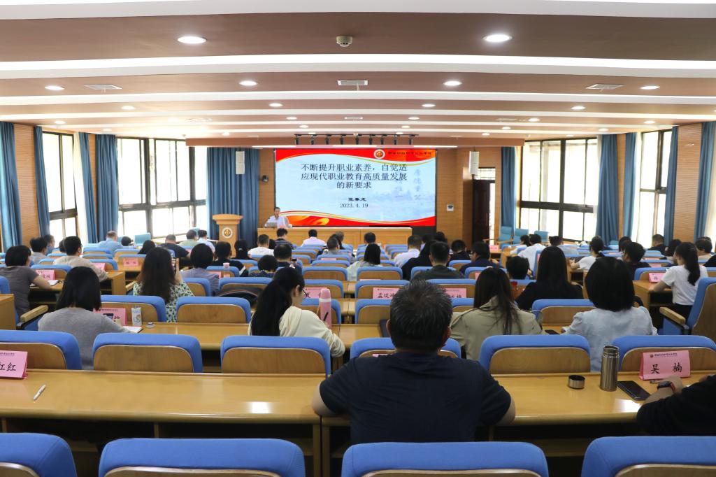 4月19日下午,学校副院长张秦龙以《不断提升职业素养,自觉适应现代职业教育高质量发展的新要求》为题,在继续教育培训厅为处科级干部和基层党组织书记作专题培训报告,全体处科级干部和各基层党组织书记110余人聆听报告。