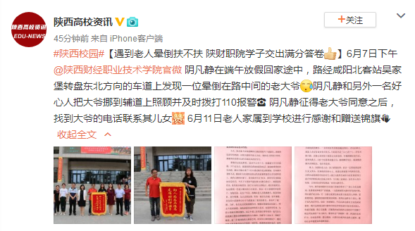 【三秦网】路遇老人晕倒扶不扶 陕财职院学子的满分答卷!