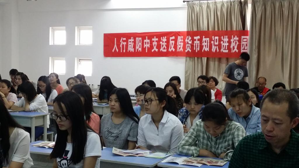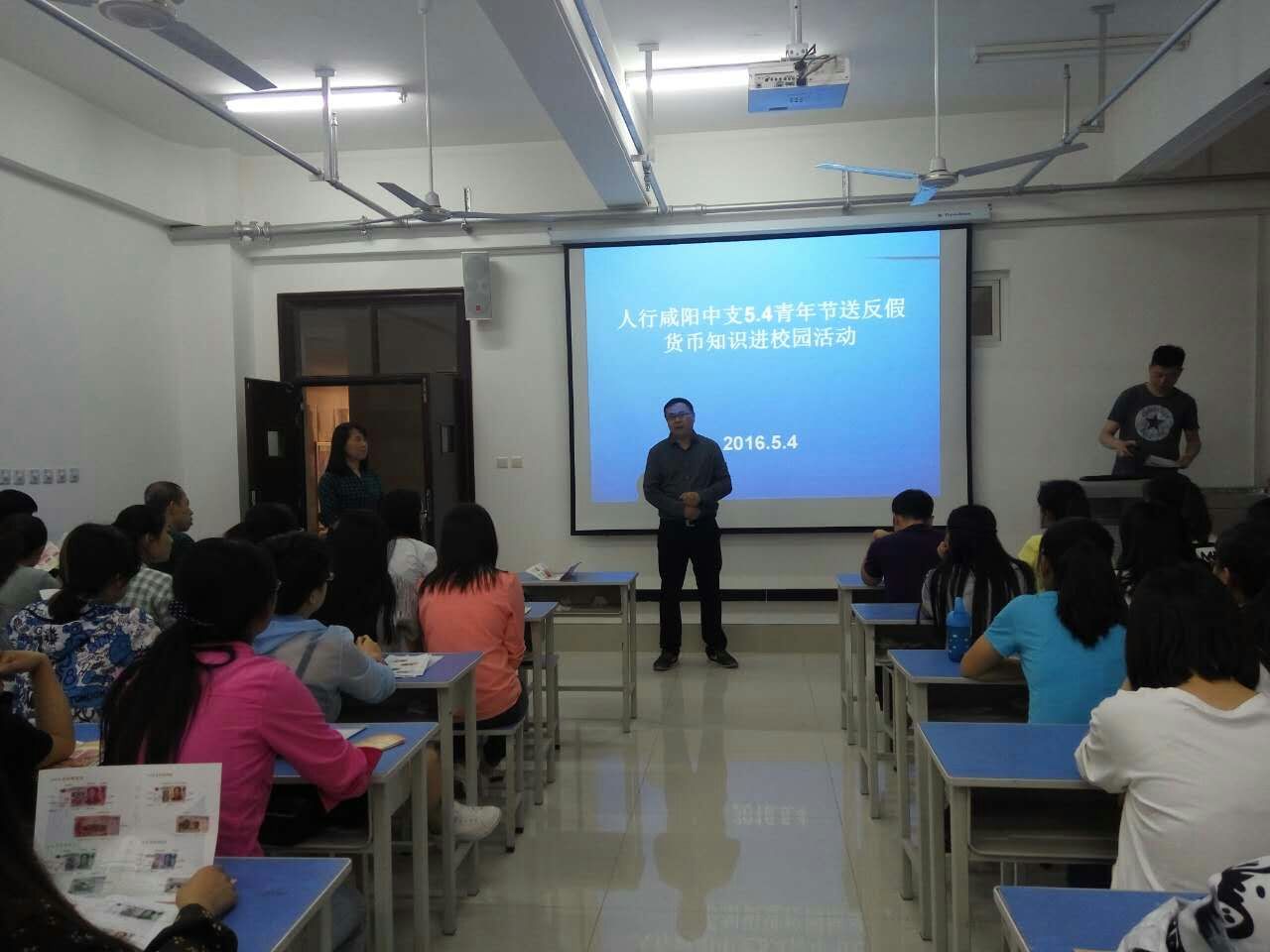 2016年5月4日下午四点,经济与金融管理系携手中国人民银行咸阳中心支行成功开展反假币知识进校园活动。中国人民银行咸阳中心支行货币金银科科长柯玉宏及相关工作人员、经金系副主任景海萍和金融教研室全体教师、2014级金融与证券专业全体学生参加了此次活动。